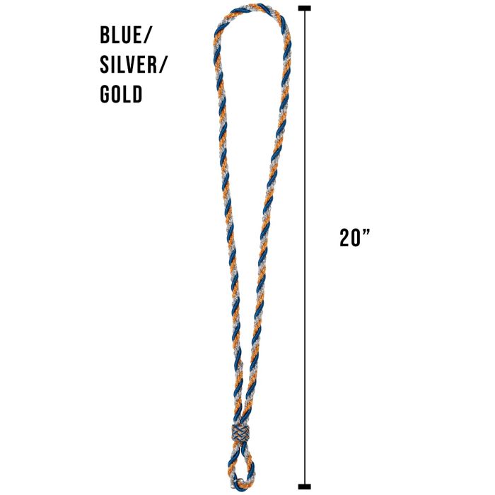 The 3 Strand Clergy Cord in Blue, Silver and Gold features a premium design. The length of the cord is 40" when worn around the neck, measured from one end to the other.