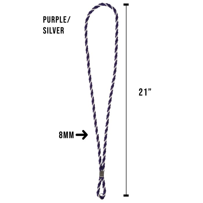 A clergy cord in purple and silver, designed to be worn around the neck, typically measures 42 inches in total length from one end to the other when laid flat. When worn, the drop from the back of the neck to the ends is approximately 21 inches, accommodating a dignified and traditional appearance for bishops or other clergy roles. matching the ceremonial and symbolic requirements of liturgical attire.