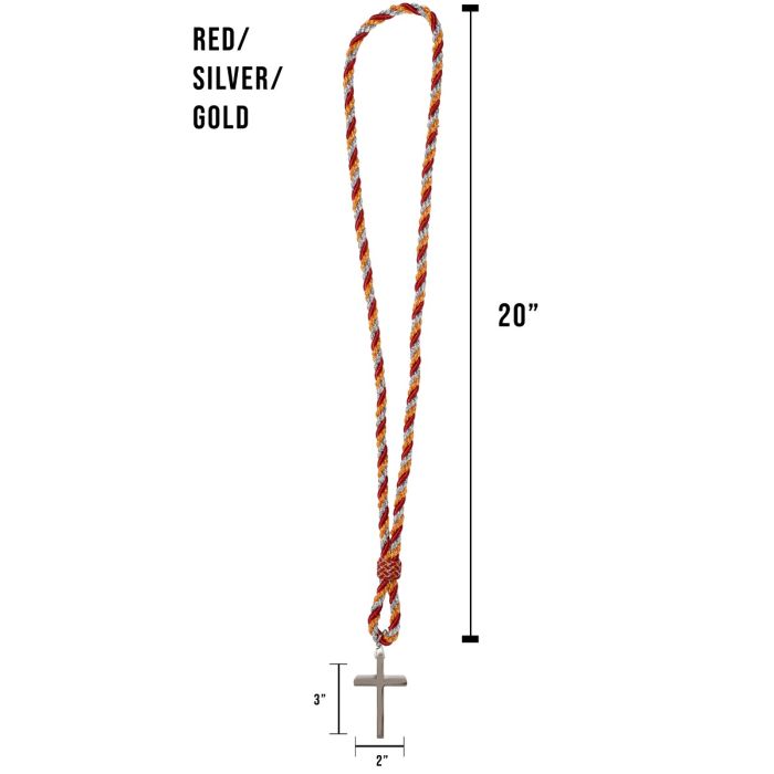 The 3 Strand Clergy Cord in Red, Silver, and Gold features a premium design. The length of the cord is 40" when worn around the neck, measured from one end to the other.Stainless steel silver plated Cross measures 2"x3"