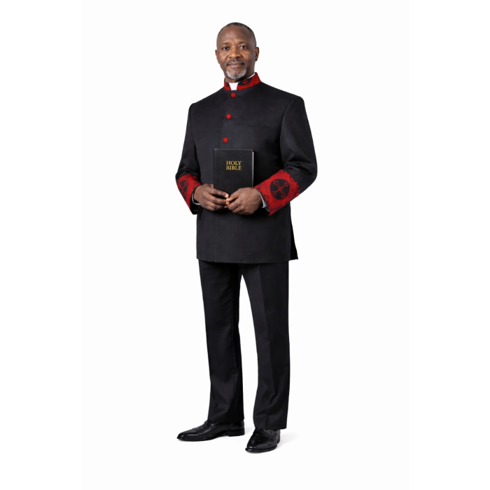 Introducing the Clergy Jacket 002 in Black/Black-Red LT, part of our exclusive designer clergy jacket series. This elegant jacket features distinctive black and red liturgical fabric accents on the cuffs, neckband, and buttons. It is designed with soft shoulder pads for added comfort and a polished look. The fully lined jacket includes two front pockets for practicality, making it a stylish choice for clergy wear.