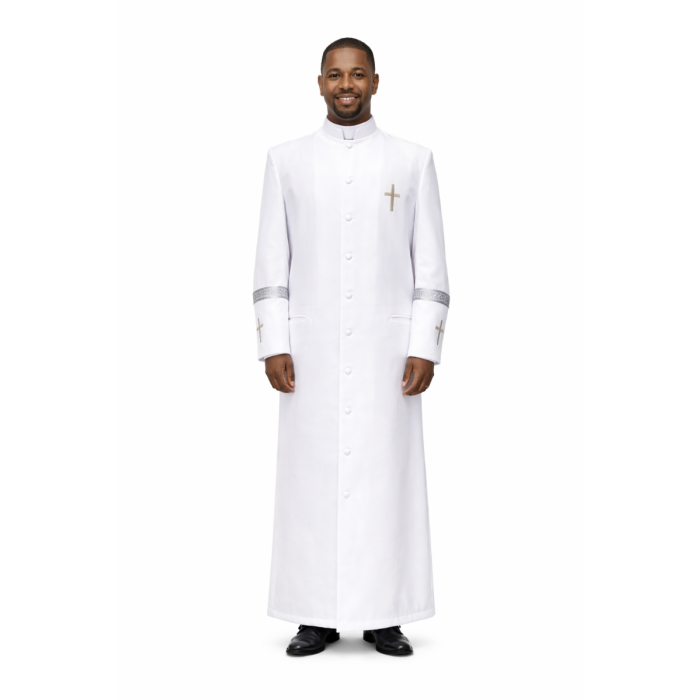 Elevate your liturgical wardrobe with the BNH151 Clergy Robe, a masterpiece of clean lines and striking detail. This robe is expertly tailored from White Superfine Poly fabric, offering a crisp, professional look that holds its shape through every service.