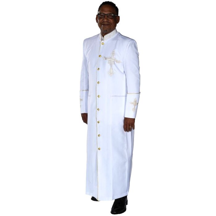 This white clergy cassock has gold detailed hand embroidery applique on the cuffs, neckband, and top left side. Gold piping edges and gold buttons, 7 inch cuffs, soft shoulder pads, and full-length button front closure. Lined inside halfway to the waist.