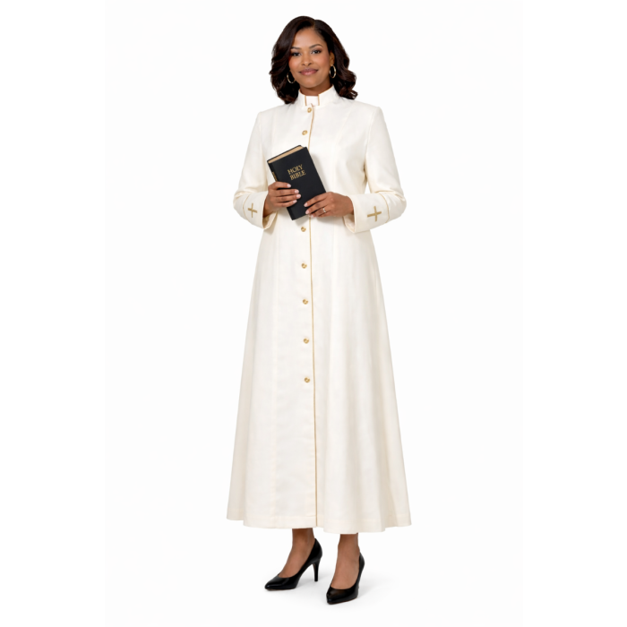 The LR117 Women’s Clergy Cassock is crafted in a refined cream-and-gold design, featuring elegant gold trim along the edges and a distinctive 5-inch deep cuff. Each cuff is adorned with a hand‑crafted appliqué cross embroidered in gold, adding a graceful and meaningful touch. The robe includes two side pockets for convenience and is made from a superfine poly fabric for comfort and durability. A single back pleat provides ease of movement and a tailored finish.