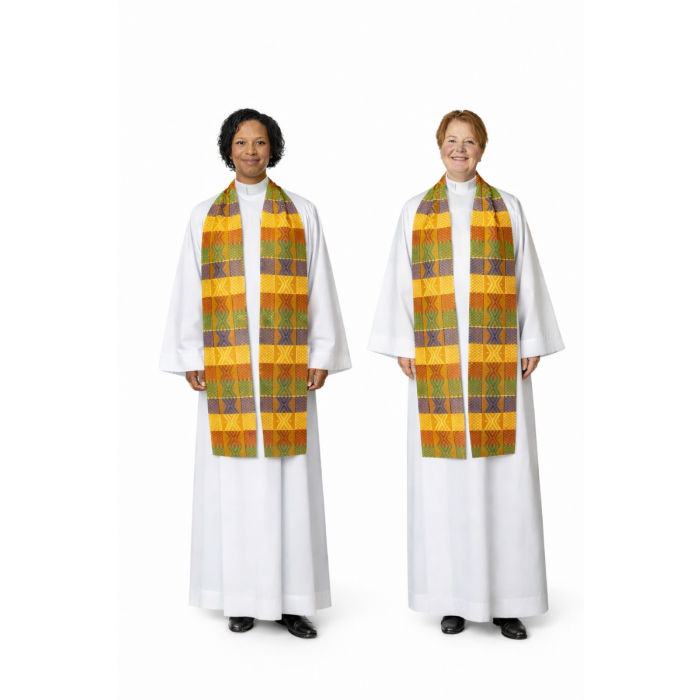 The Kinte Clergy Tippet – Style KINTE 02 is a powerful expression of cultural legacy and sacred calling. Inspired by traditional Kente patterns symbolizing unity, strength, and spiritual leadership, this tippet adds vibrant dignity to any clergy robe or cassock.
