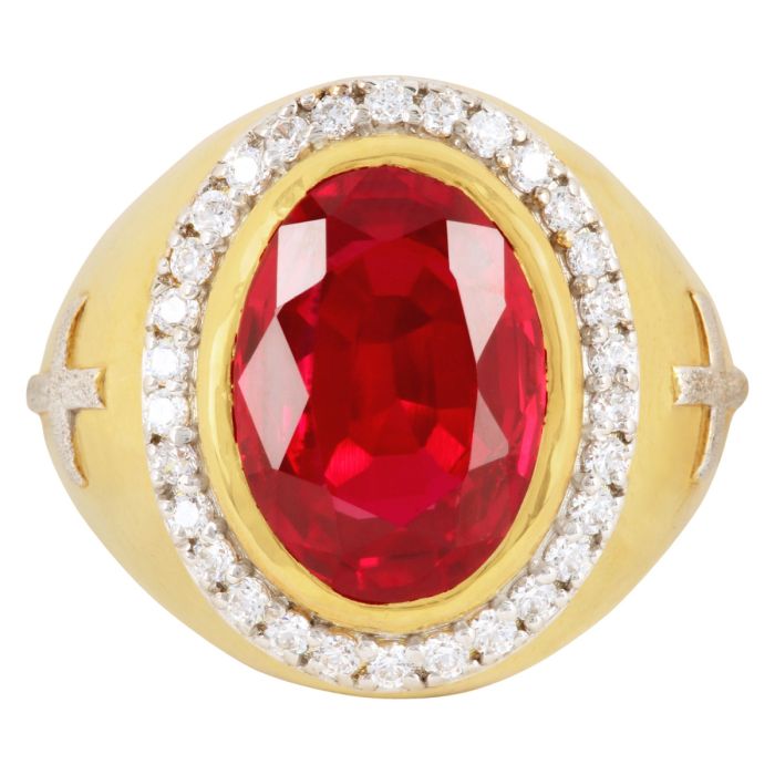 Expertly manufactured in 925 sterling silver and finished with luxurious 24-carat gold plating, this ring offers both durability and a rich, radiant gold appearance. At its heart lies a striking red ruby centerpiece, symbolizing passion, power, and divine authority. Surrounding the ruby stone is a brilliant halo of Swarovski fire crystal white stones, meticulously set to enhance sparkle and brilliance from every angle.