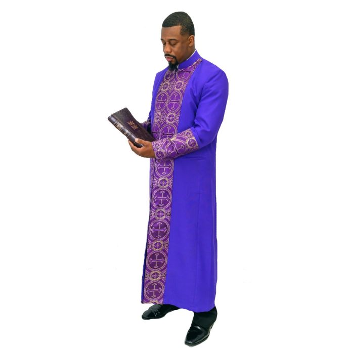 • Opulent Purple Gold Liturgical Detailing: The front panel, cuffs, and pleat inserts are adorned with intricate purple-gold liturgical brocade featuring ornate cross motifs and embroidered patterns, adding a regal touch of sacred sophistication.