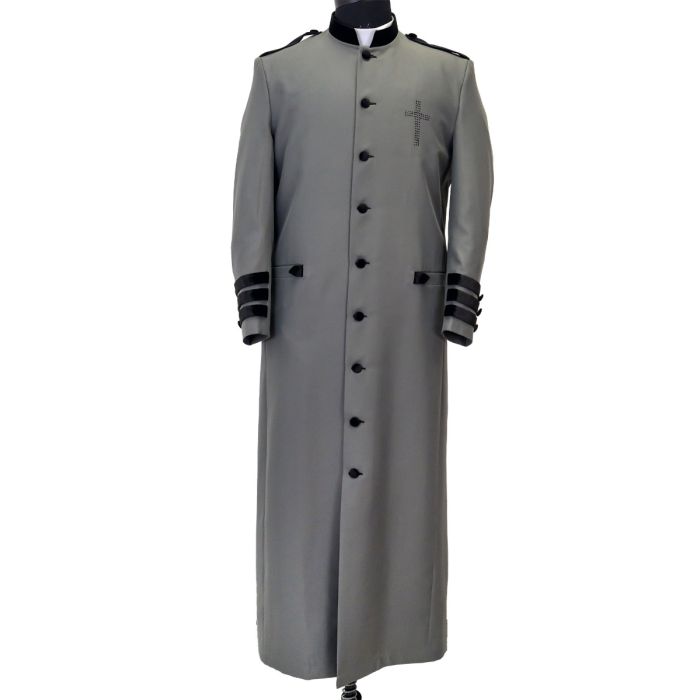Another Mercy Robes Exclusive Collection. This classic, unique clergy cassock robe in gray has a black velvet neckband, black velvet shoulder flaps, black velvet buttons, and black velvet straps across the cuffs. Made with 100% superfine gray poly material, the cassock is half lined to the waist, the front panel fully fused, soft shoulder pads, and one pleat in the back.