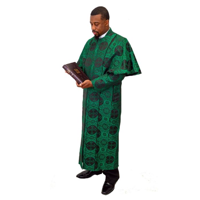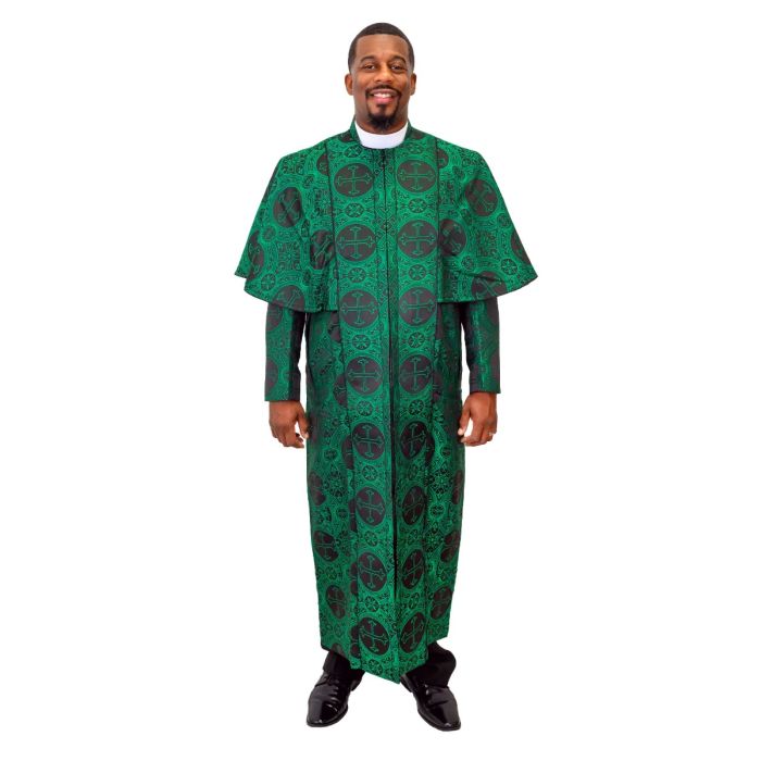 Elevate your ministry wardrobe with this distinguished Men’s Clergy Cassock Robe, expertly crafted to bring together tradition, elegance, and comfort. Designed in a rich green and black liturgical brocade, this robe showcases intricate church-inspired patterns that express reverence while making a bold visual statement.