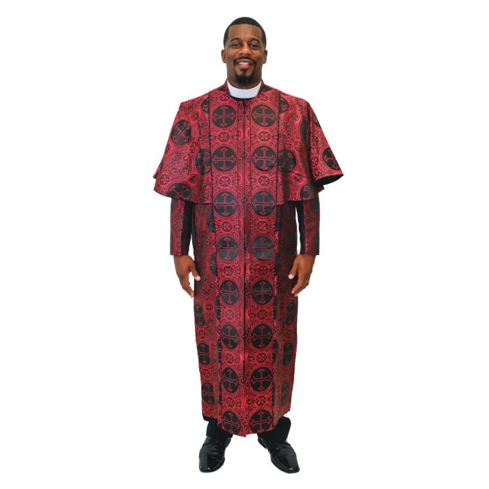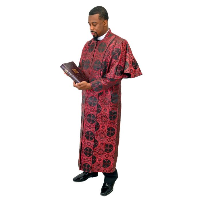 Elevate your ministry wardrobe with this distinguished Men’s Clergy Cassock Robe, expertly crafted to bring together tradition, elegance, and comfort. Designed in a rich red and black liturgical brocade, this robe showcases intricate church-inspired patterns that express reverence while making a bold visual statement.