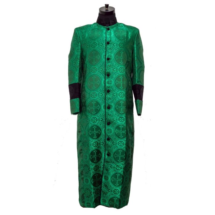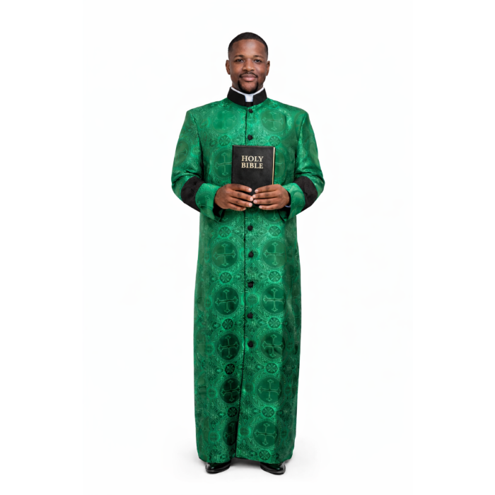 Step into timeless elegance with our newly released men’s clergy cassock, crafted in rich green liturgical brocade fabric featuring subtle sacred symbols woven throughout. This statement piece is a refined blend of tradition and style, perfect for high holy services, ordinations, and special ecclesiastical events.