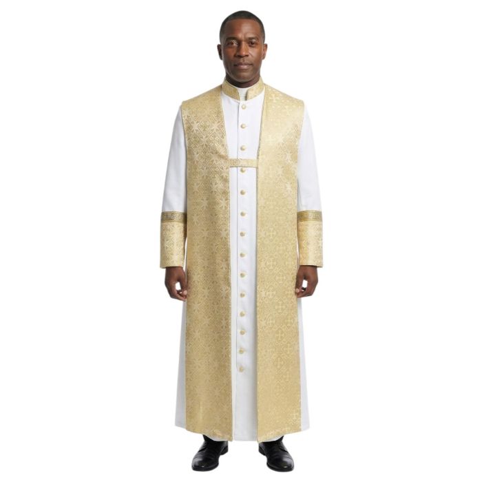 The robe features a classic full-length cassock silhouette with a structured stand collar and a clean row of front buttons, creating a dignified and polished appearance. The crisp white base symbolizes purity and reverence, while the rich liturgical accents elevate the overall design.