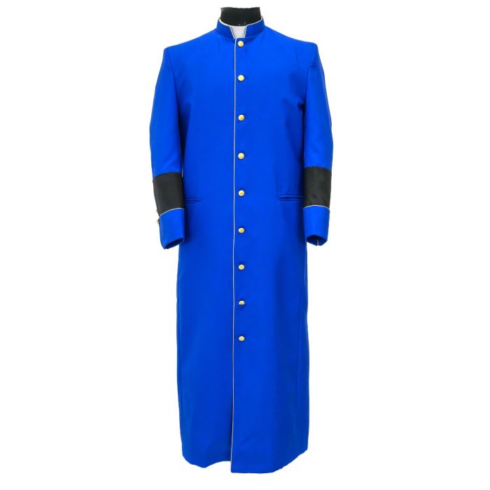 Introducing MENS ROBE STYLE BPM122 in Royal Blue/Black, a full-length men's clergy robe designed for comfort and elegance. This robe features soft shoulder pads for added support, two convenient front pockets, and a single back pleat for ease of movement. The design includes a half lining to the waist with a fully fused front panel, ensuring a polished appearance. Perfect for those seeking a blend of style and functionality in their clergy attire.