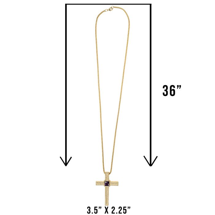 The Pectoral Cross N74-C442G-A features a stunning design with a faceted Amethyst simulated purple stone, complemented by a gold plate finish. It is elegantly suspended from a 36-inch gold-plated, clasped belcher chain. The cross itself showcases a detailed pebbled texture, adding to its visual appeal. The overall weight of the cross along with the chain is 4 ounces,Cross Size: 2 3/8" W x 31/2" HÂ making it a substantial yet comfortable piece to wear.