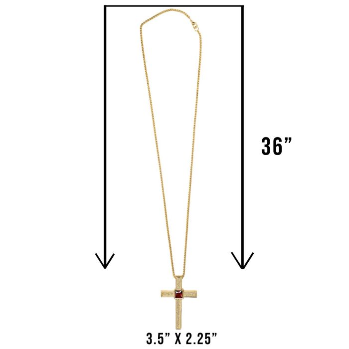 Gold Plated Pebbled Pectoral Cross Cast Pewter Pebbled Cross with a faceted Red Ruby cubic zirconia and a gold plate finish. 36" gold plate, clasped, belcher chain.