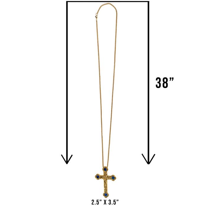 The Pectoral Cross features a stunning design adorned with four royal blue stones, each expertly placed for a striking appearance. It comes with a 38-inch chain, allowing for versatile wear. The gold-plated finish adds an elegant touch, making it a beautiful accessory for any occasion. Gift Box not included...