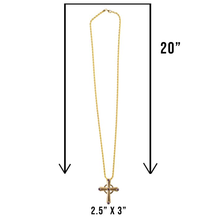 The Pectoral Cross with Chain Style SUBS779 G-P features a beautifully designed cross that measures 3" in length and 2.5 " in width. It is adorned with five precisely placed simulated purple amethyst stones, adding a touch of elegance. The set includes a 40-inch rope chain, crafted from stainless steel and finished with yellow gold plating, ensuring durability and a luxurious appearance. The cross itself is made from stainless steel, providing a sturdy and timeless piece. Suede box not included..