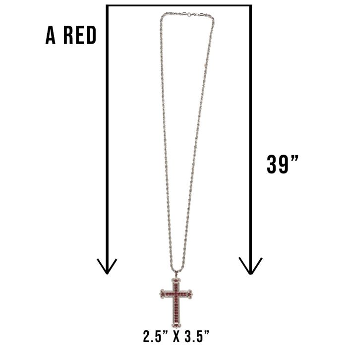 * Pectoral Cross Measures Height 3.50" x Width 2.50" * Designed With Red Fire Stones * Cross Includes 40 inch Rope Chain * Alloy Metal Cross With Silver Shine Plated Finish * Iron Rope Chain with Silver Shine Plated Finish * Total Weight 90 Grams.