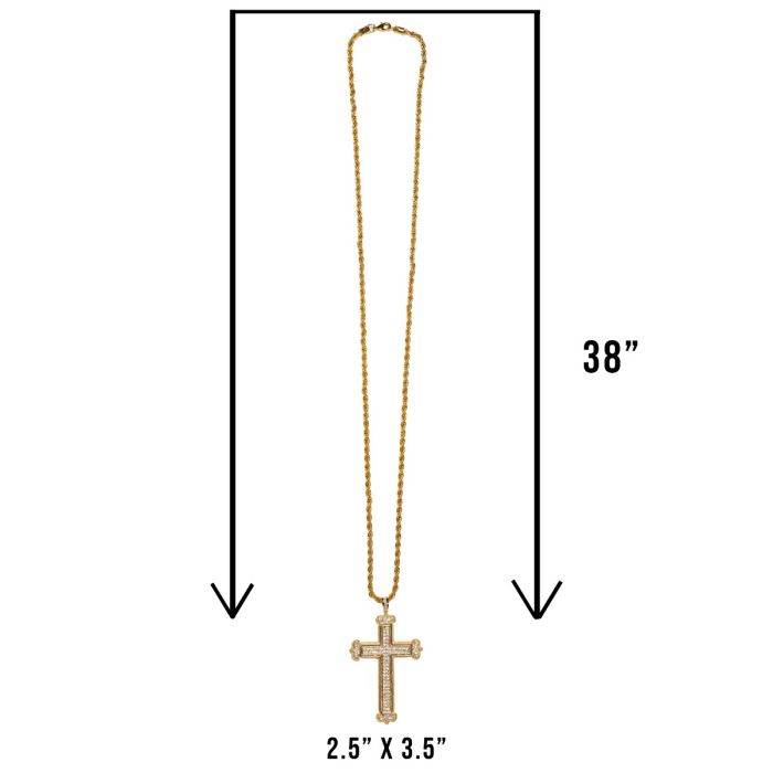 The Pectoral Cross features a height of 3.50 " and a width of 2.50", beautifully designed with small white fire stones. It comes with a 40-inch rope chain, both the cross and chain have a stunning gold shine plated finish. The total weight of the piece is 90 grams.