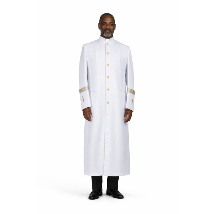 Introducing the ROBE STYLE BPN125 in White and Gold—an exquisite clergy cassock designed to balance regal sophistication with exceptional comfort. This luminous white robe is accented with brilliant gold details, making it the premier choice for weddings, baptisms, and celebratory liturgical services.