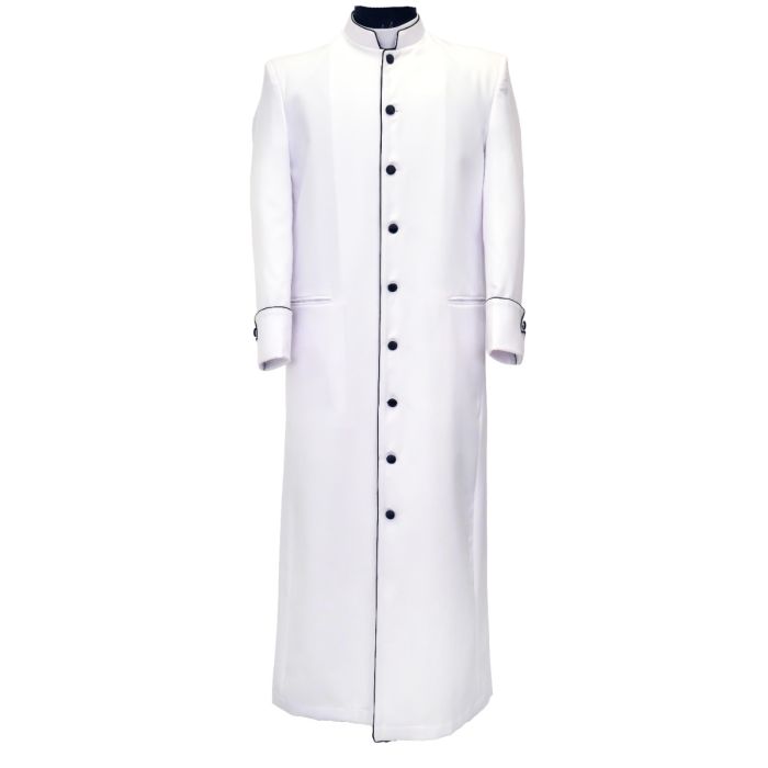The Clergy Robe Style BPF106 features a classic white with elegant black satin cord piping edges and buttons. It has 4-inch cuffs and a full-length button front closure, ensuring a polished appearance. The inside is lined to the waist for added comfort, and the front panel is fully fused for structure, while a single pleat in the back allows for ease of movement. When choosing a size, it's recommended to select based on your suit jacket size.