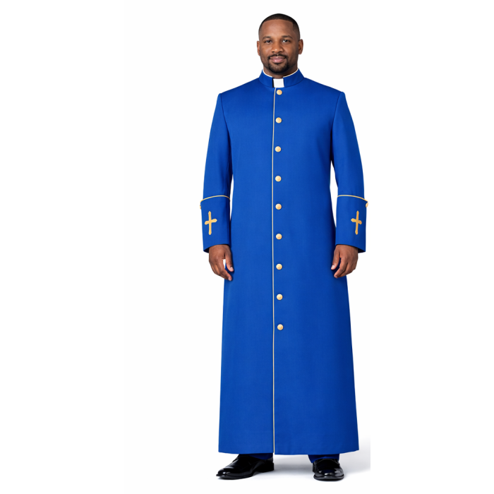 This Clergy Cassock is Royal Blue with a fine gold trim on the edges. Deep cuffs and hand crafted applique cross design embroidery on the cuffs in gold. This cassock also comes in Red /gold piping.