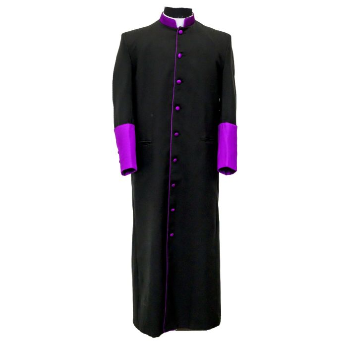 Introducing the ROBE STYLE BPA105 in black and purple. This full-length robe features a sleek design crafted from super fine poly fabric, complemented by rich purple satin accents on the cuffs and neck band. The robe is detailed with purple piping and buttons, a single back pleat for added elegance, and a front button closure. It is half lined to the waist, ensuring a comfortable fit. Choose your size based on your suit jacket measurement for the perfect fit.