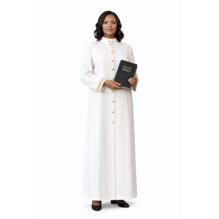 This elegant women’s clergy cassock robe, is crafted in pure white year around superfine polyester material. Designed for comfort and style, half lined to the waist, soft shoulder pads, and 9 gold front buttons. lightweight, durable, and ideal for all seasons. The robe is adorned with 2-inch gold brocade at the sleeve ends and gold embroidered crosses on both sleeves, adding a regal touch. Perfect for weddings or preaching engagements, this women clergy cassock combines sophistication with functionality.