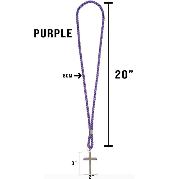 Introducing a stunning Roman purple clergy cord featuring a stainless steel silver cross. The length of the cord, when worn around the neck, measures 40"Â from one end to the other. The cross itself is beautifully designed, measuring 2 "wide by 3" high. This elegant piece is perfect for clergy and those seeking a meaningful accessory.