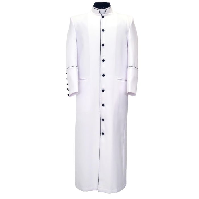 This white with black piping clergy cassock robe is made with super fine year round polyester fabric. 7 inch deep cuffs, soft shoulder pads, 2 front pockets and half lined to the waist. Elevate your worship experience with the Clergy Robe BPA101 in classic white and black. This elegant robe combines timeless style with comfort, making it perfect for any religious ceremony or service. Designed for ease of movement and a polished appearance, the BPA101 enhances your presence while reflecting your dedication. Ideal for clergy members seeking a sophisticated and professional look.