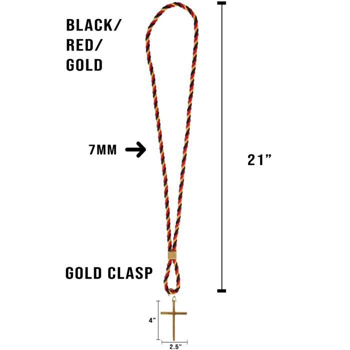 This three tone clergy cord with cross is a striking clergy accessory that blends vibrant colors with a sleek design. The bold black and red tones create a dynamic contrast, while the metallic gold adds a touch of sophistication. Perfect for those who appreciate a modern aesthetic, this cord is ideal for various uses, whether for fashion or functionality. The stainless-steel gold-plated cross measures 4” by 2.50”. The length of the cord is 42 inches when worn around the neck. Elevate your clergy style with this eye-catching piece that stands out in any setting.