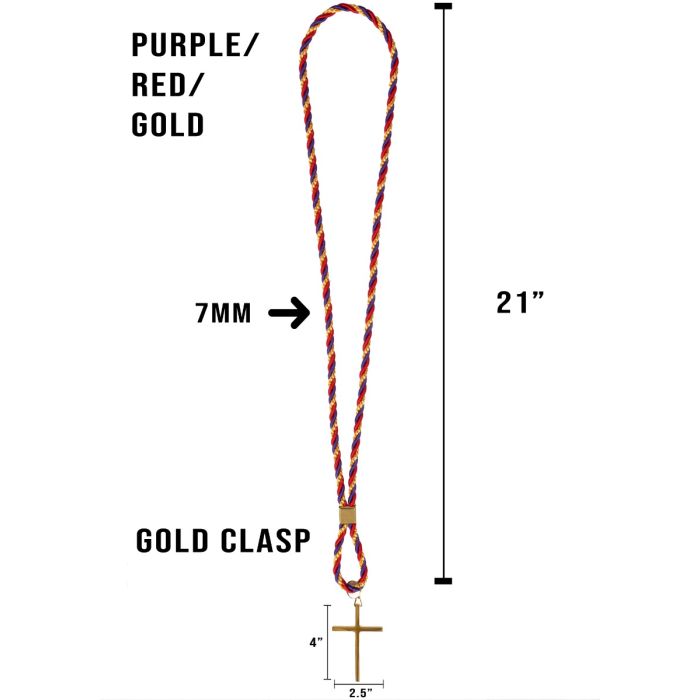 This three tone clergy cord with cross is a striking clergy accessory that blends vibrant colors with a sleek design. The bold purple and red tones create a dynamic contrast, while the metallic gold adds a touch of sophistication. Perfect for those who appreciate a modern aesthetic, this cord is ideal for various uses, whether for fashion or functionality. The stainless-steel gold-plated cross measures 4” by 2.50”. The length of the cord is 42 inches when worn around the neck. Elevate your clergy style with this eye-catching piece that stands out in any setting.