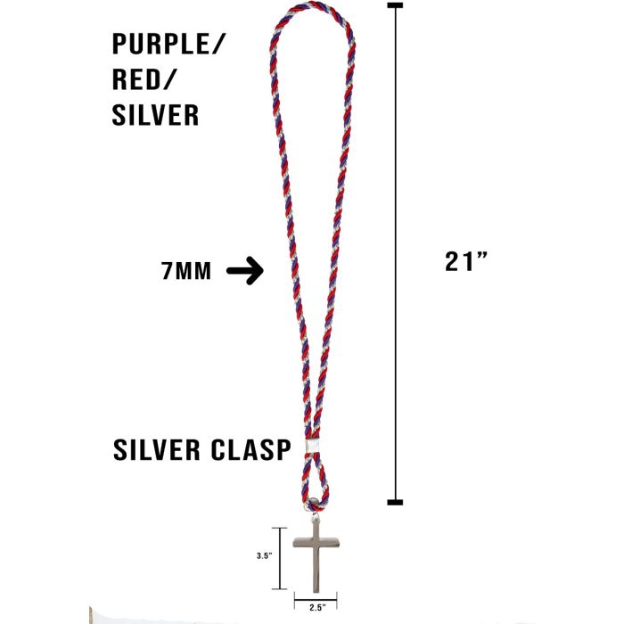 Elevate your style with the Three Tone Purple/Red/Metallic Silver Cord featuring a stunning stainless steel silver-plated cross. This unique accessory combines vibrant colors and a sleek design, making it a perfect statement piece for any outfit. Ideal for both casual and formal occasions, it adds a touch of faith and fashion to your look. Perfect as a gift or a personal treat, this cross cord is sure to impress. Three-tone red/purple & metallic silver cord featuring a stainless steel silver-plated cross. The length of the cord is 42 inches when worn around the neck, and the cross measures 2 inches wide by 3 inches high.