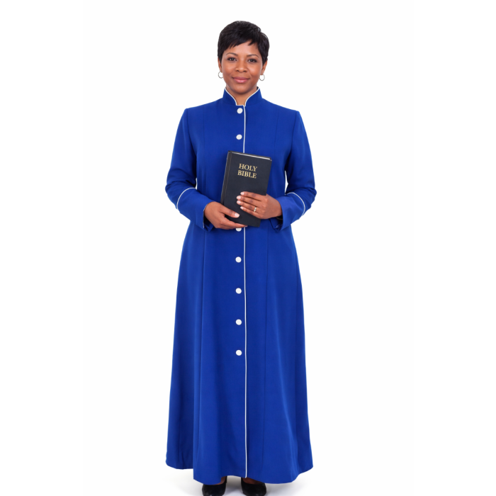 Designed for elegance and comfort, this full-length royal blue/white clergy robe is perfect for women in ministry, especially for overseers.
