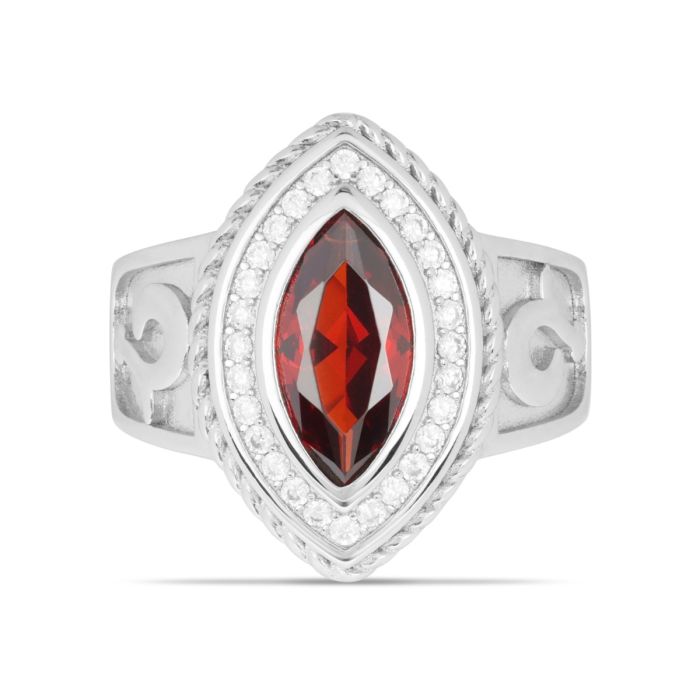 At the heart of this exquisite piece lies a marquise-style simulated red ruby stone. The dazzling brilliance and refined allure are bound to capture attention and elevate any ensemble.