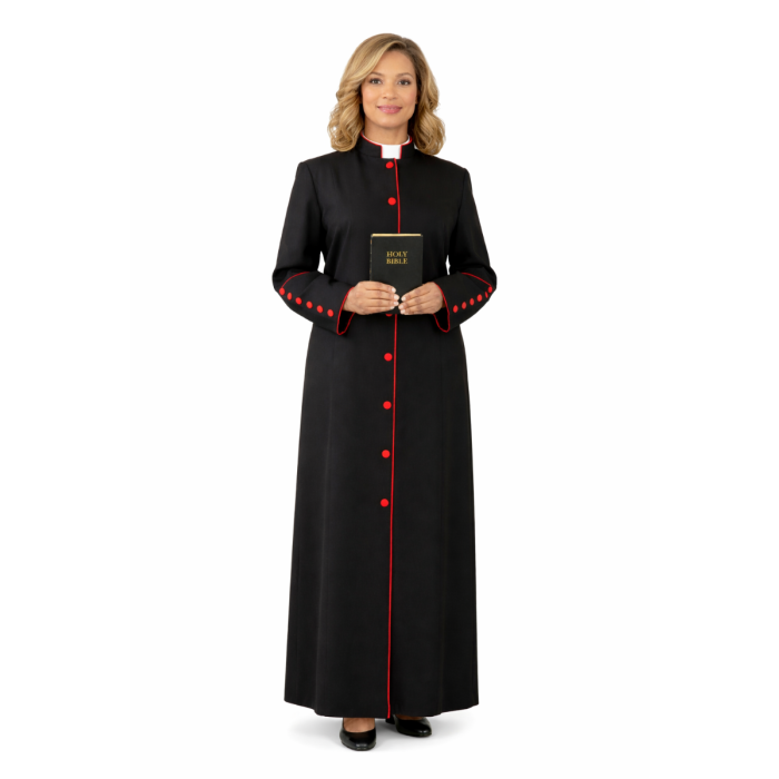 The LR111 Women’s Clergy Robe in Black with Red trim combines classic church elegance with modern tailoring. Designed for pastors and clergy leaders, this full-length robe features bold red satin piping, matching front buttons, structured clergy collar, and wide cuffs with red accents. A single open back pleat provides comfort and ease of movement during services.