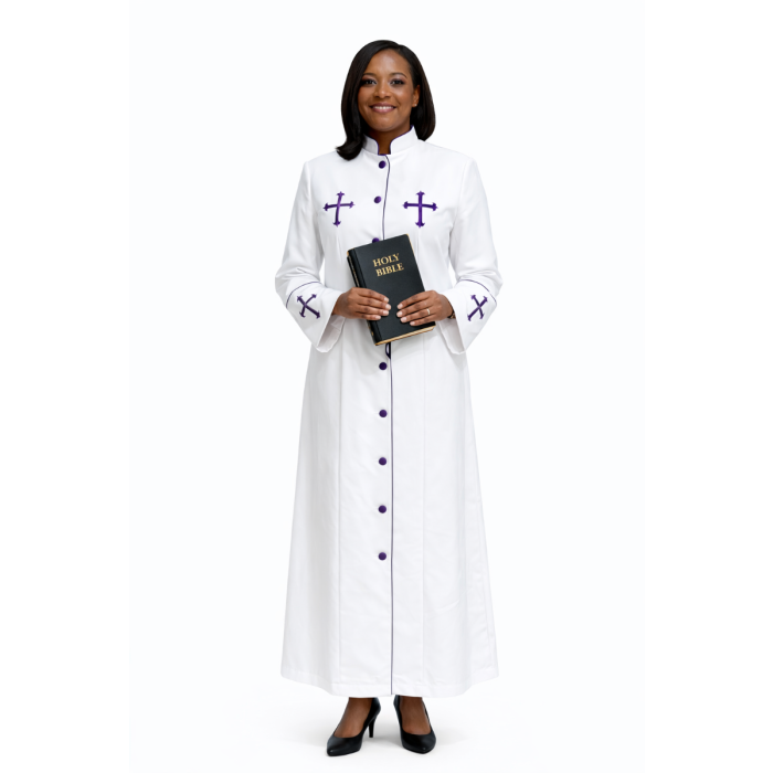Elevate your ministry presence with this elegant Women’s White Clergy Robe featuring refined purple cross embroidery and matching satin piping. Designed for pastors, ministers, evangelists, and church leaders, this robe blends timeless tradition with modern tailoring.