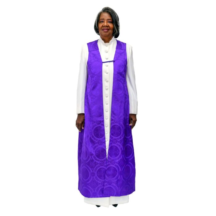 Experience timeless clergy style with our Traditional Liturgical Chimere, crafted from Roman Purple premium liturgical brocade for a rich luxurious finish. Designed for pastors & overseers who value both tradition and elevated fashion, this full-length chimere features intricate woven liturgical motifs, a refined front panel, and a sleek closure tab for a polished regal look.
