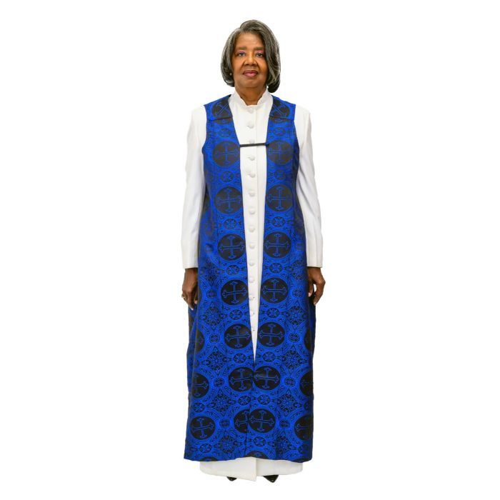 Experience timeless clergy style with our Traditional Liturgical Chimere, crafted from Royal Blue/Black premium liturgical brocade for a rich luxurious finish. Designed for pastors & overseers who value both tradition and elevated fashion, this full-length chimere features intricate woven liturgical motifs, a refined front panel, and a sleek closure tab for a polished regal look.